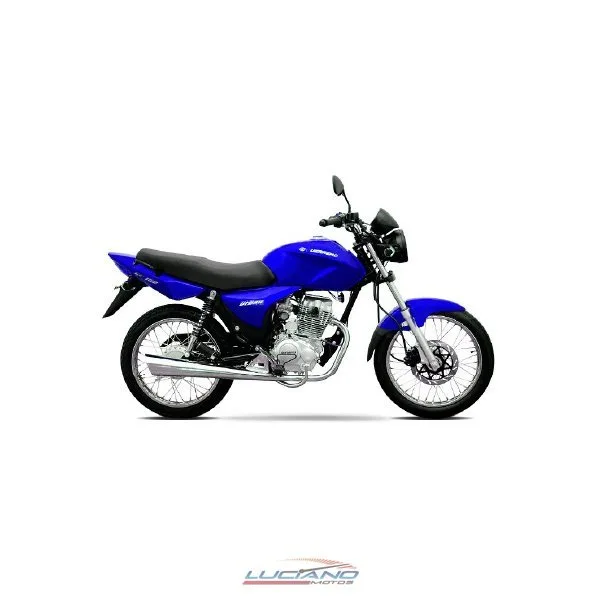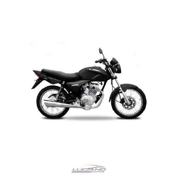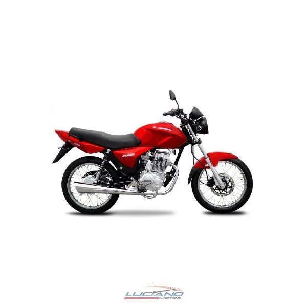 DescripciónEMBRAGUE:Multidisco en baño de aceiteCAPACIDAD DE COMBUSTIBLE:14 LTS.FRENO TRASERO:TamborFRENO DELANTERO:DiscoSUSPENSIÓN DELANTERA:Horquilla telescópica hidráulicaSUSPENSIÓN TRASERA:Doble amortiguadorCAMBIOS:5 velocidadesBATERÍA:12 VTRANSMISIÓN:CadenaENCENDIDO:C.D.I.ARRANQUE:Eléctrico / PatadaCILINDRADA:149 CC.MOTOR:Monocilíndrico 4 tiemposREFRIGERACIÓN:AireLLANTAS:Aleación